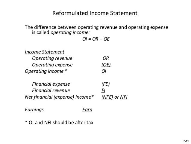 There are of course many other ways in which we can play around with the reformulated balance sheet. Conclusions and financial statements reformulated financial. Tax Allocation Example Tax Rate 35 GAAP INCOME STATEMENT TAX ALLOCATION TOP-DOWN APPROACH TAX ALLOCATION BOTTOM-UP APPROACH GAAP INCOME STATEMENT. Summary of Reformulation steps Reclassify GAAP income and expense items into core operating non-core operating and financial activities Read footnotes. The total tax reported was 3612 million on income in the income statement minus 4002 million in tax benefits from stock options. Financial Statement Analysis and Security Valuation 5th Edition Edit edition Solutions for Chapter 10 Problem 5E. Calculate the taxes on NNE financing items 2. Articulation of Reformulated Financial Statements Income Statement NIt OIt -NFEt Balance Sheet Net operating assets Net financial obligationsNOAt NOA t -1 OIt - Ct-It NFOt NFOt-1 NFEt Ct-It dt Common stockholders equity CSEt CSEt-1 OIt NFEt - dt Cashflow Statement FCF or Ct-It dt Ft. For example if there is any change in shareholder equity or company made the dividend distribution it is must for the business to reformulate its income statement and. Companies can use the overall results to find the net profit or loss incurred for the period ended at the end of the year.